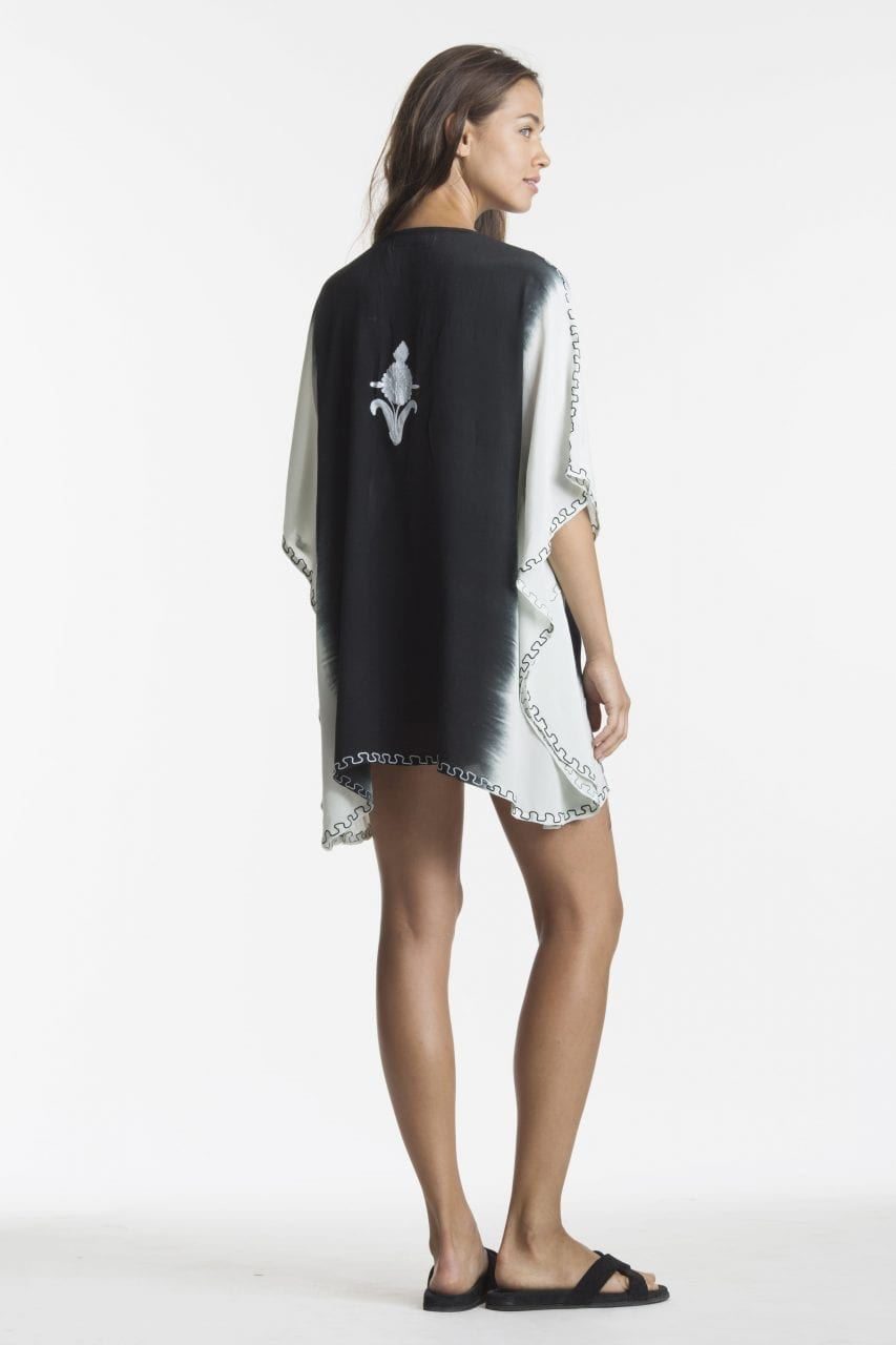 Loose-fitting black and white hand dyed silk caftan enhanced with white embroidery, perfect for a resort events, vacation or pool party.